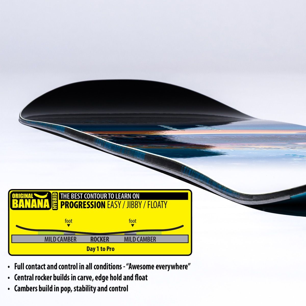 The Glider is a fun, easy to ride, do everything dream board that lives up to its name. The Award winning Original Banana rocker/camber contour continues to re-define modern snowboarding with its ability to float, carve, and glide into freestyle progression. Our Banana Tech and Magne-Traction® combine to make the Glider playful with confidence building edge control. The Glider is an easy choice for first time to full time riders. New mildly wider widths accommodate more feet.